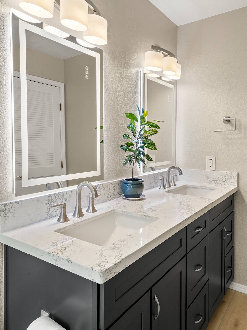 We are thrilled with GVD's recent completion of three bathroom remodels. The master suite is a true retreat, featuring quartz countertops, porcelain flooring, and modern fixtures. The guest bath showcases a shower with green and white subway tiles, champagne bronze fixtures, and LVP flooring that maximizes a smaller space beautifully. And the hall bath combines durability and style, a perfect design that will last for many years. GVD’s commitment to quality craftsmanship shined through in every detail, delivering excellent results that exceeded our expectations.